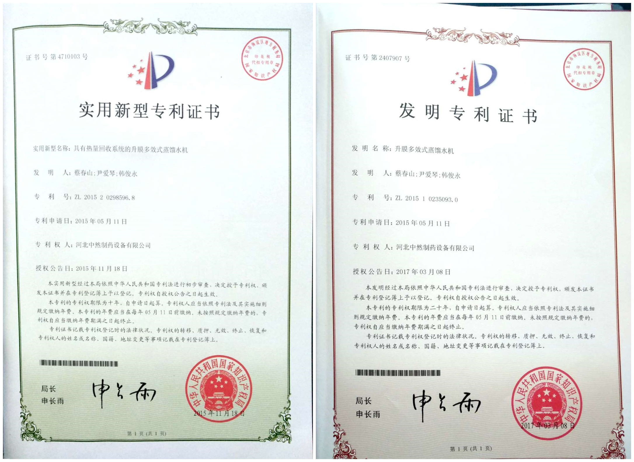 1、升膜式多效蒸馏水机及升膜式纯蒸汽发生器曾获得发明专利2项,实用新型专利14项;