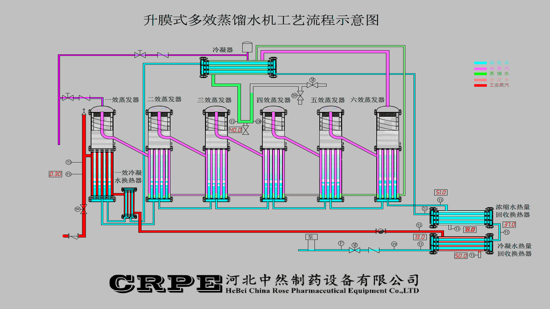 1. 节能:升膜式多效蒸馏水机的重要特征是不浪费能源,并且还将工业蒸汽冷凝水的热量80%以上回收利用。
